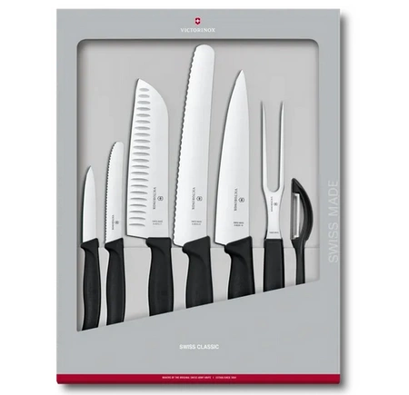 Zestaw profesjonalnych noży to podstawa wyposażenia domowej kuchni w zaawansowanym wydaniu. i najlepsze wsparcie Twojej kulinarnej kreatywności. Na dobry początek potrzebujesz noży, które ułatwią kuchenne czynności i będą wygodne w użyciu. Właśnie takie są modele tworzące nasz 7-elementowy zestaw kuchenny Swiss Classic. Obejmuje wszystkie niezbędniki do doskonalenia umiejętności krojenia, siekania i obierania ze skórki. Dzięki niemu zyskasz wprawę zawodowych szefów kuchni.